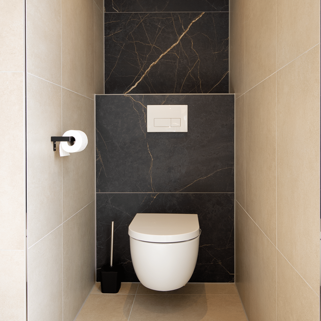 Hoge contrasten kunnen een extra sterk en stoer uiterlijk geven aan je badkamer. Dat bewijst dit ontwerp. De marmerlook en beige tegels geven het geheel een zachte en luxueuze touch. De ultieme balans! Wij zijn fan.