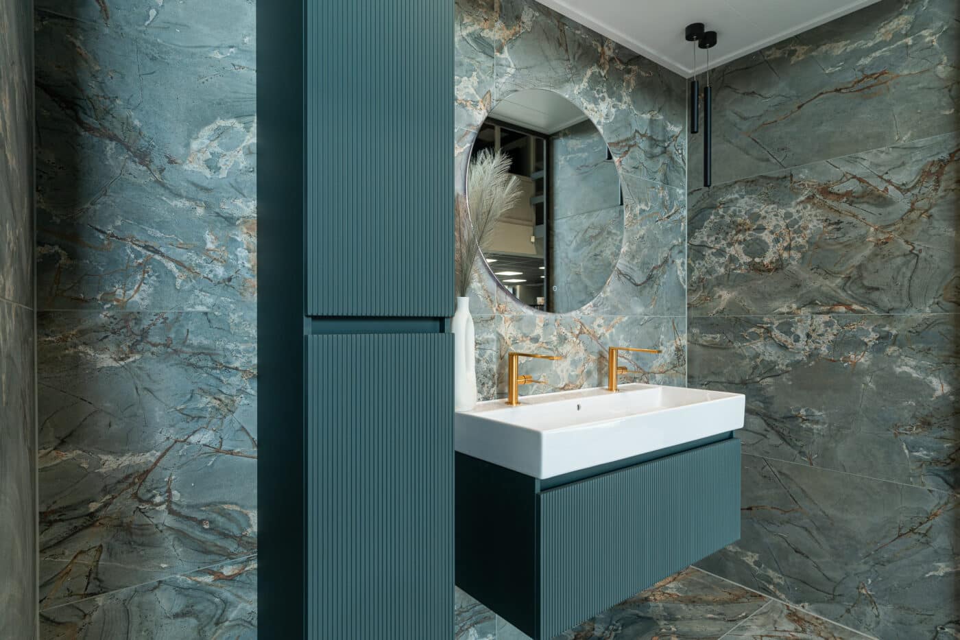 Het bijpassende badmeubel met een verfijnde geribbelde afwerking voegt textuur en diepte toe aan het ontwerp. De gouden kranen vormen een mooi contrast met het koele turquoise en geven de ruimte een warme, luxe uitstraling.